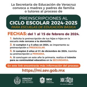 La Secretaría de Educación de Veracruz (SEV) informó que del 4 al 15 de febrero de 2025 se llevarán a cabo las preinscripciones para los primeros años de preescolar, primaria y secundaria en las escuelas públicas del estado.