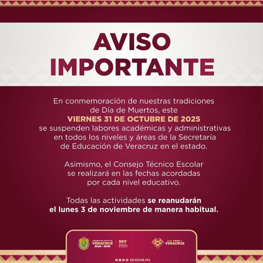 Preservar las tradiciones es parte de la educación integral que se impulsa en Veracruz, por este motivo y con motivo del Día de Muertos, se suspenden clases el viernes 31 de octubre. #PorAmorAVeracruz.