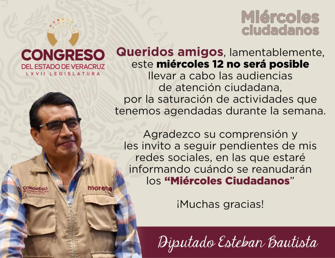 Amigas y amigos, este miércoles 12 de marzo NO SE LLEVARÁ A CABO LA ATENCIÓN CIUDADANA, por cuestiones de trabajo y de agenda legislativa saturada.