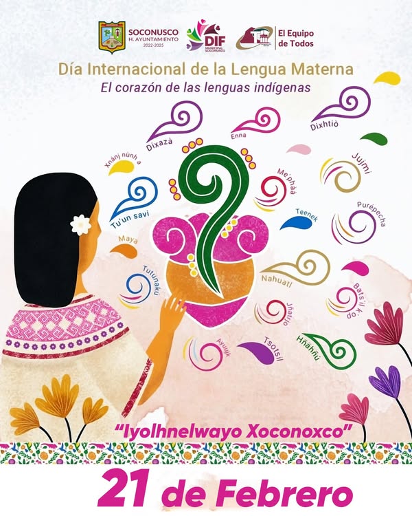 Puede ser un dibujo de texto que dice "を SOCONUSCO .AYUNTAMIE DIF 純菜品 宙 El Equipo de Todos Día Internacional de la Lengua Materna EI corazón de las lenguas indígenas Enna Dixazà กลก nunh Dixhtio Jujmi Tu'un savi Maya Mepha epháa eenek purépecha 9 nχe Nahuat/ Bats Bats do, !በአና ojeyi Isotsil ิท "Iyolhnelwayo Xoconoxco" 21 de Febrero"