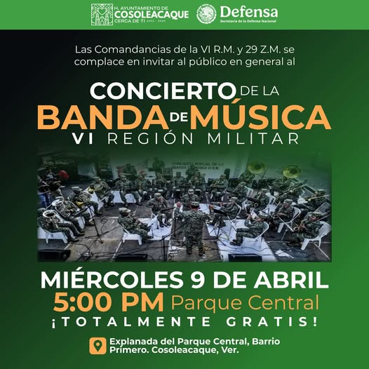 Inicio/Locales/ Locales abril 8, 20250 Facebook Twitter Messenger Messenger WhatsApp Telegram Concierto de la Banda de Música VI Región Militar | Miércoles 9 de abril del 2025 | Parque Central. Etiquetascosoleacaque abril 8, 20250 Facebook Twitter Messenger Messenger WhatsApp Telegram Compartir Facebook Twitter Messenger Messenger WhatsApp Telegram