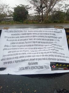 – La tatde de este domingo, fueron localizadas tres narcolonas en diferentes puntos de la ciudad, las cuales presuntamente se adjudican a un grupo delictivo que se identifica como “Cártel Mafia Veracruzana”, con las siglas FEGS.