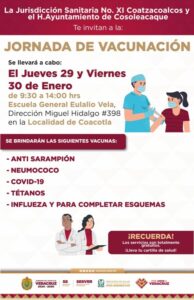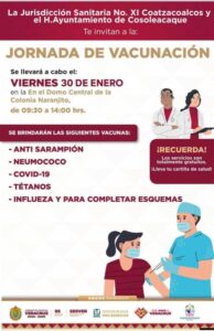 La Jurisdicción Sanitaria número 11 de Coatzacoalcos, en coordinación con el H. Ayuntamiento de Cosoleacaque, extiende módulos de vacunación en la localidad Coacotla y la colonia El Naranjito, donde se brindarán las siguientes dosis: Anti Sarampión, Neumococo, Covid-19, Tétanos, influenza y para completar esquema, con un horario de atención de 9:30 a 2 de la tarde.