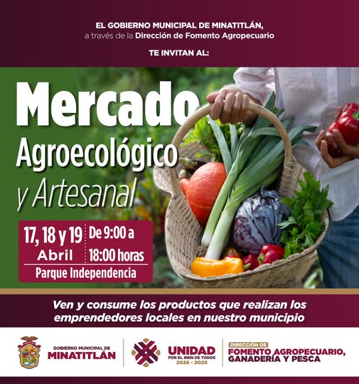 El Gobierno Municipal que preside el maestro Guillermo Reyes Espronceda, mediante la Dirección de Fomento Agropecuario te invitan al Mercado Agroecológico y Artesanal, un espacio donde encontrarás productos frescos, saludables y hechos con el talento de nuestros emprendedores.