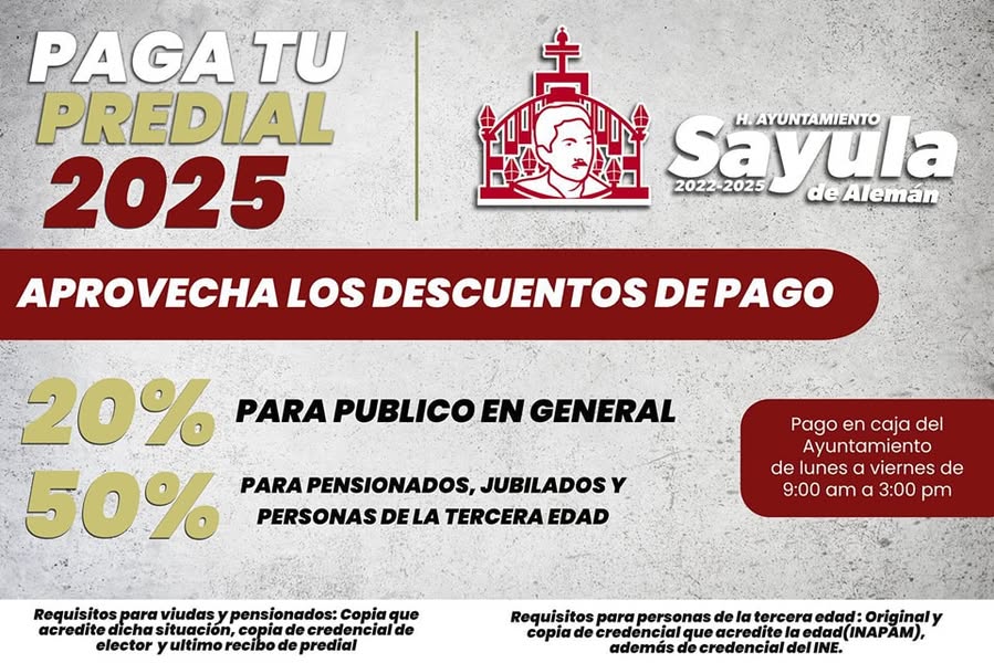 Puede ser una imagen de texto que dice "PAGA τυ PREDIAL 2025 H.AYUNTAMIENTO 2022-2025 Sayula de Aleman APROVECHA LOS DESCUENTOS DEPAGO 20% PARA PUBLICO EN GENERAL 50% PARAPENSIONADOS, JUBILADOS Y PERSONASDELA TERCERA EDAD Pago en caja del Ayuntamiento de lunes viernes de 9:00 am α 3:00 pm Requisitos para viudasy pensionados: Copia que acredite dicha situacion opia de credenciale de elector y ultimo recibo de predial Requisitos para personas de c tercera edad: Original copia de credenciala que acredite edad(INAPĂM), además de credencial del INE."