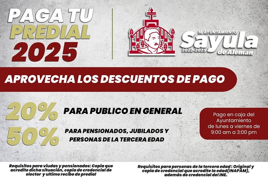 Puede ser una imagen de texto que dice "PAGA TU PREDIAL 2025 法 Sayula H.AYUNTAMIENTO 2022-2025 deAleman APROVECHA LOS DESCUENTOS DEPAGO 20% PARA PUBLICO EN GENERAL 50% PARAPENSIONADOS, JUBILADOS Y PERSONASDELA DELA TERCERA EDAD Pago en caja del Ayuntamiento de lunes viernes de 9:00 am α 3:00 pm Requisitos para viudas pensionados: Copia que acredite dicha situacion pia de credenciald elector yultimo recibo de predial Requisitos para personas de I tercera edad: Original copia de credencial que acredite edad(INAPĂM), edad (INAP además de credencial del deliNE INE."
