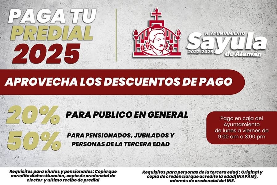 Puede ser una imagen de texto que dice "PAGA TU PREDIAL 2025 Sayula 2022-202 H.AYUNTAMIENTO deAlemán APROVECHA LOS DESCUENTOS DEPAGO 20% PARA PUBLICO EN GENERAL 50% PARAPENSIONADOS, JUBILADOS Y PERSONASDELA TERCERA EDAD Pago en caja del Ayuntamiento de lunes viernes de 9:00 am α 3:00 pm Requisitos para viudas pensionados: Copia que acredite dicha situacion opia de credenciale de elector yultimo recibo de predial Requisitos para personas de a tercera edad: Original copia de credencial que acredite edad aedad(INAPĂM), INAP además de credencial del INE."