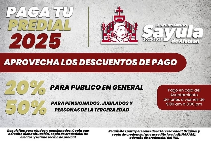 Puede ser una imagen de texto que dice "PAGA TU PREDIAL 2025 2022-2025 Sayula H.AYUNTAMIENTO deAlemán APROVECHA LOS DESCUENTOS DEPAGO 20% PARA PUBLICO EN GENERAL 50% PARAPENSIONADOS, JUBILADOS Y PERSONASDELA TERCERA EDAD Pago en caja del Ayuntamiento de lunes viernes de 9:00 am α 3:00 pm Requisitos para viudas pensionados: Copia que acredite dicha situacion pia de credencial de elector yultimo recibo de predial Requisitos para personas de Ια tercera edad: Original) copia copiadecredencialque de credencialg que acredite edad INAP además de credencial del delINE. INE."