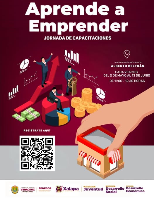 Las direcciones de Juventud, Desarrollo Económico y Desarollo Social, en colaboración con la Secretaría de Desarrollo Económico y Portuario del Estado de Veracruz, te invitan a participar en la jornada de capacitaciones del programa «Aprende a Emprender»