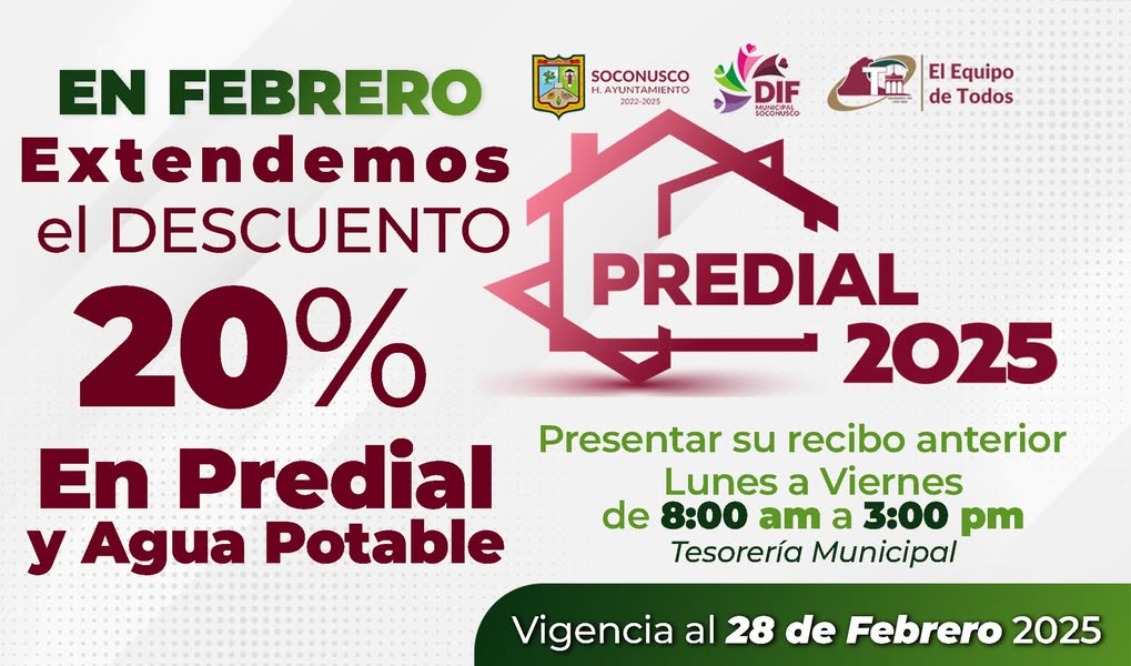 Atención contribuyentes, la oficina de Recaudación Municipal informa la extensión del beneficio del 20% de descuento en el pago del Predial 2025 y Agua Potable, es importante presentar su recibo anterior, la vigencia es hasta el 28 de febrero.