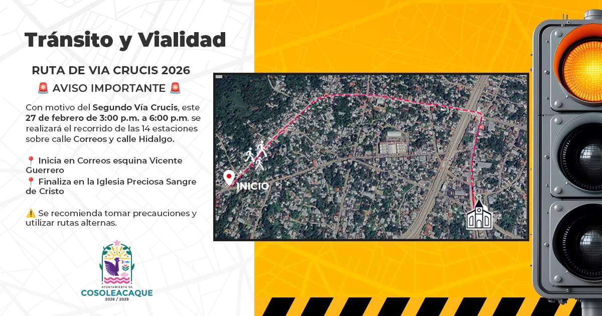 Con motivo del segundo viacrucis, se informa a la ciudadanía que este 27 de febrero, en un horario de 3:00 p.m. a 6:00 p.m., se llevará a cabo el recorrido de las 14 estaciones.