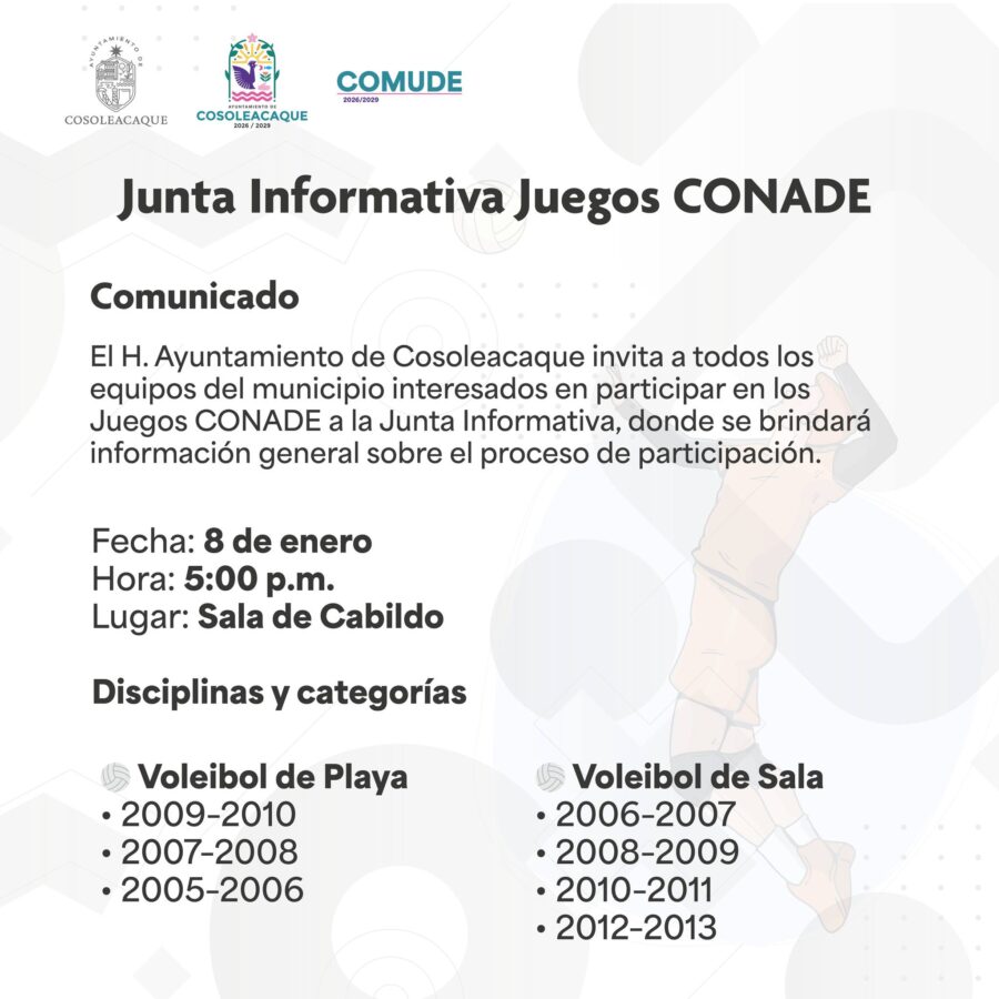 El Ayuntamiento de Cosoleacaque, a través de COMUDE, invita a todos los equipos interesados a la Junta Informativa de los Juegos CONADE 2026.