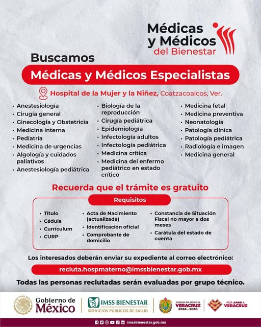 Atención!!! El IMSS bienestar en Veracruz solicita especialistas médicos, para el hospital de especialidades en COATZACOALCOS.