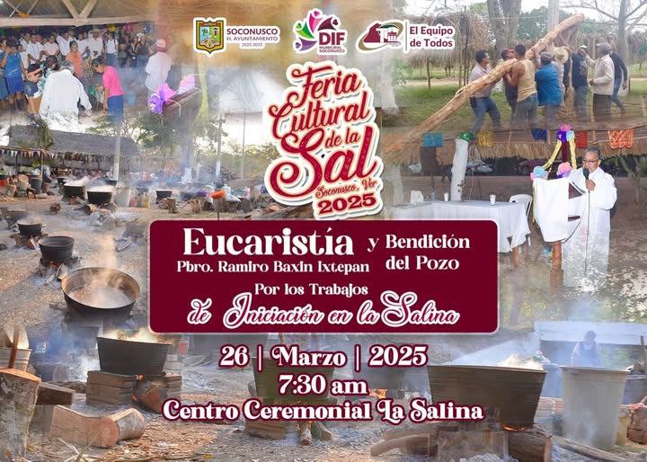 El Honorable Ayuntamiento de Soconusco Veracruz que preside el Lic. Cuauhtémoc Baruch Custodio hace extensa la invitación al pueblo en general a la Eucaristía y Bendición del Pozo de la Sal a cargo del Pbro. Ramiro Baxin Ixtepan, con motivo de los trabajos de iniciación en La Salina. Este miércoles 26 de marzo 2025 a las 7:30 AM Centro Ceremonial La Salina. Convive y forma parte de nuestra cultura y tradición.