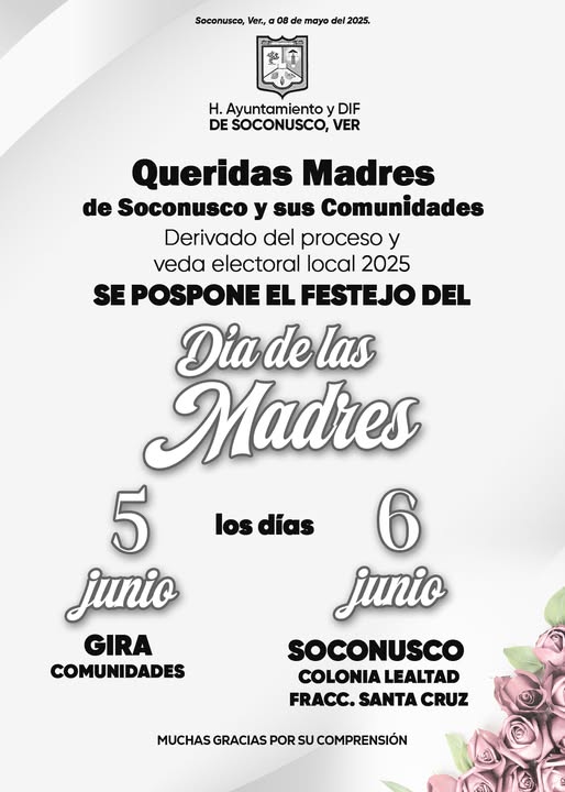Puede ser una imagen de texto que dice "Soconusco, Ver., αο O de mayo del 2025. H. Ayuntamiento y DIF DE SOCONUSCO, VER Queridas Madres de Soconusco y sus Comunidades Derivado del proceso y veda electoral local 2025 SE POSPONE EL FESTEJO DEL Diadelas Madres 5 los días 6 junio junio GIRA SOCONUSCO COMUNIDADES COLONIA LEALTAD FRACC. SANTA CRUZ MUCHAS GRACIAS POR SU COMPRENSIÓN"