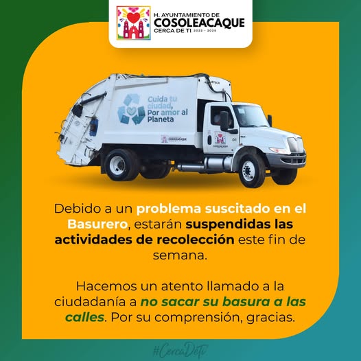 | Debido a un problema suscitado en el Basurero, estarán suspendidas las actividades de recolección este fin de semana.
