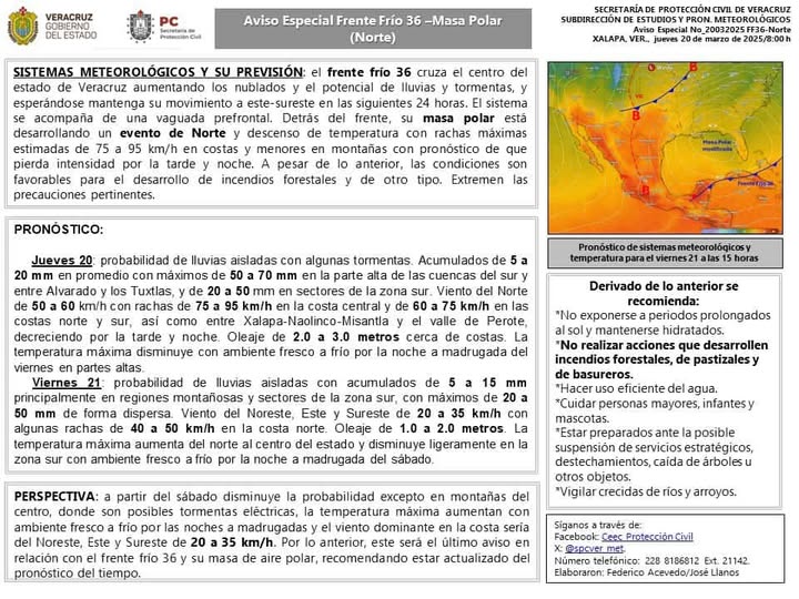 SISTEMAS METEOROLÓGICOS Y SU PREVISIÓN: el frente frío 36 cruza el centro del estado de Veracruz aumentando los nublados y el potencial de lluvias y tormentas, y esperándose mantenga su movimiento a este-sureste en las siguientes 24 horas. El sistema se acompaña de una vaguada prefrontal. Detrás del frente, su masa polar está desarrollando un evento de Norte y descenso de temperatura con rachas máximas estimadas de 75 a 95 km/h en costas y menores en montañas con pronóstico de que pierda intensidad por la tarde y noche. A pesar de lo anterior, las condiciones son favorables para el desarrollo de incendios forestales y de otro tipo. Extremen las precauciones pertinentes.