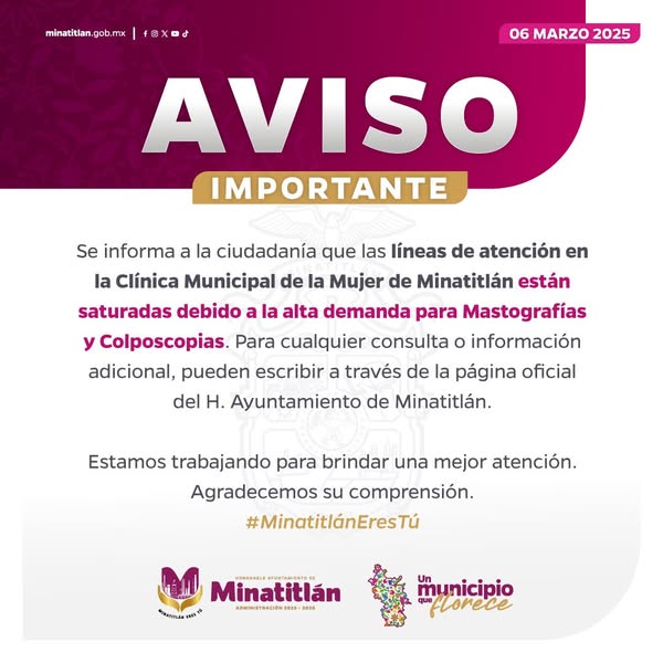 Las líneas de atención en la Clínica Municipal de la Mujer están saturadas debido a la alta demanda de Mastografías y Colposcopias. Para más información, comuníquese a través de la página oficial del H. Ayuntamiento de Minatitlán.