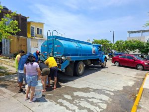 El Ayuntamiento informa que este día se mantiene activo el operativo emergente y gratuito de distribución de agua, a través de 9 pipas que recorren las colonias del poniente de la ciudad que más lo requieren, como Puerto Esmeralda, Punta Caracol, San Martín, Santa Martha, entre otras.
