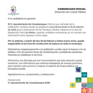 H. Ayuntamiento de Cosoleacaque informa que, derivado de la determinación respecto al sitio de disposición final Las Matas, quedan suspendidas temporalmente las rutas de recolección de basura en el municipio, a partir de hoy y hasta nuevo aviso.