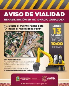 A partir de este lunes 13 de abril, desde las 10:00 AM, comenzarán los trabajos de rehabilitación con concreto hidráulico en la avenida Zaragoza, específicamente en el tramo del Puente Palma Sola al Reloj de la Ford.