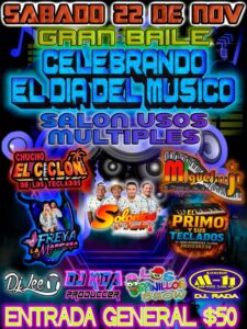 Con motivo de la conmemoración del Día del Músico, se les invita a asistir al Baile Popular que se llevará a cabo el sábado 22 de noviembre, a partir de las 8:00 p.m.