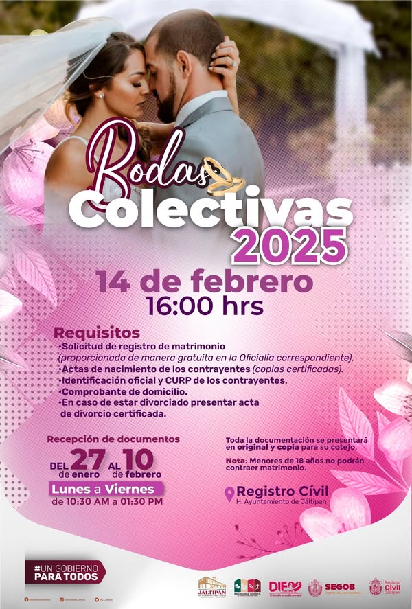 El Gobierno Municipal que dirige el Presidente Jesús Miguel Pérez Toto a través de la Regiduria Tercera, el Registro Civil y el DIF municipal, invitan a todas las parejas de Jáltipan a dar legalidad a su amor incondicional mediante las jornadas gratuitas de Bodas Colectivas 2025.