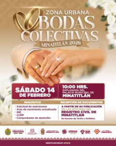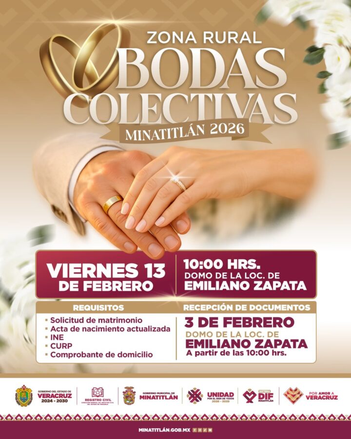 El Gobierno Municipal, en coordinación con Sistema DIF y Registro Civil invita a las parejas de Minatitlán a participar en la Campaña de Matrimonios Colectivos 2026.