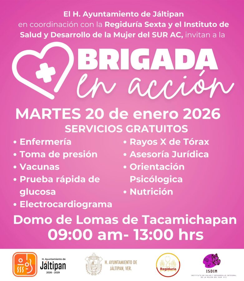 El H. Ayuntamiento que encabeza Gildardo Maldonado Guzmán en coordinación con la Regidora Sexta Lic. Miriam del Carmen Francisco Fonseca y el Instituto de Salud y Desarrollo de la Mujer del Sur invitan a la Brigada en Acción.