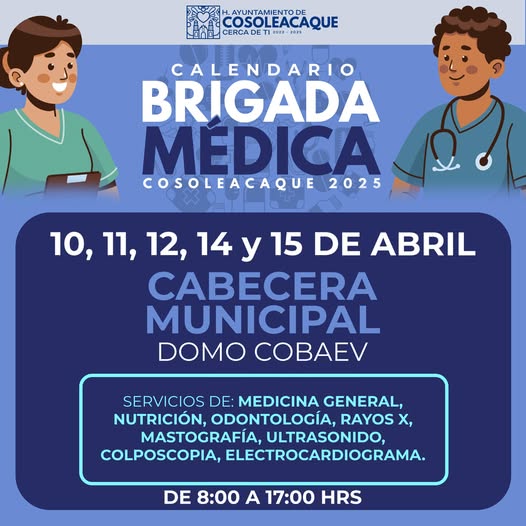10, 11, 12, 14 y 15 de Abril | SERVICIOS GRATUITOS | Cabecera Municipal - Domo COBAEV | de 8:00 a 17:00 hrs.