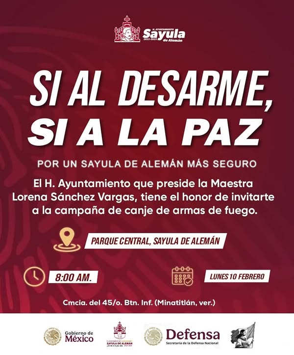 Puede ser una imagen de texto que dice "Sayula APUINTAMIENTO 2023-2005 de Alemán SI AL DESARME, SI A LA PAZ POR UN SAYULA DE ALEMÁN MÁS SEGURO El H. Ayuntamiento que preside la Maestra Lorena Sánchez Vargas, tiene el honor de invitarte α la caTpana de canje de armas de fuego. O PARQUE CENTRAL, SAYULA DE ALEMÁN 8:00 AM. LUNES 10 FEBRERO Cmcia. del 45/o. Btn. Inf. (Minatitlán, ver.) Gobierno de México SEYULADE LEVILADEALEMAN LEMAN Defensa Secretaria del SecretariacelaDefensa.Nacional aDefensa Nacienal"