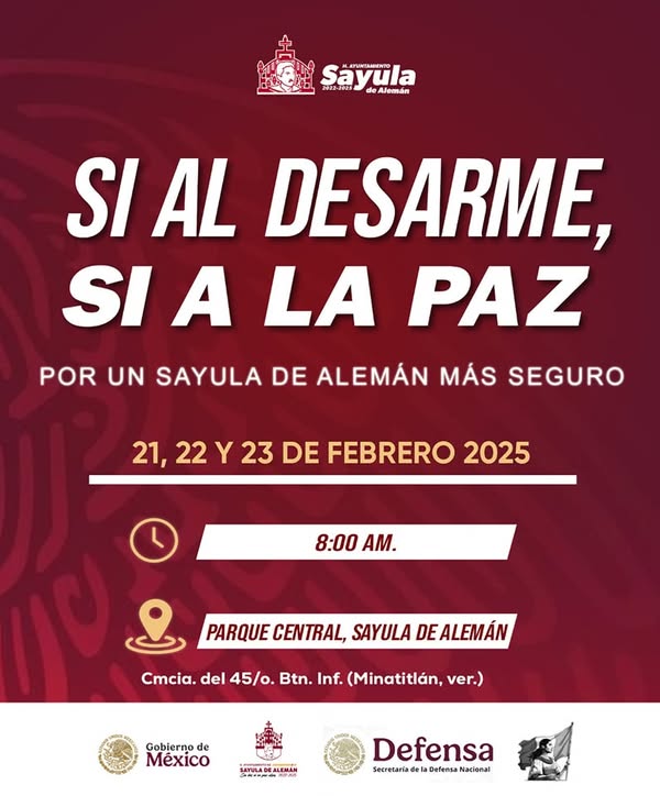 Puede ser una imagen de ‎texto que dice "‎S 2022-3005 Sayula eAlemán de SI AL DESARME, SI A LA PAZ POR UN SAYULA DE ALEMÁN MÁS SEGURO 21, 22 23 DE FEBRERO 2025 8:00 AM. PARQUE CENTRAL, SAYULA DEALEMÁN Cmcia. del 45/o. Btn. Inf. (Minatitlán, ver.) Gobierno de México ייק: ATDEALENA ALEMAN Defensa Secretaria dela aeretariaelaDefensaNacienal Defensa Nacienal‎"‎