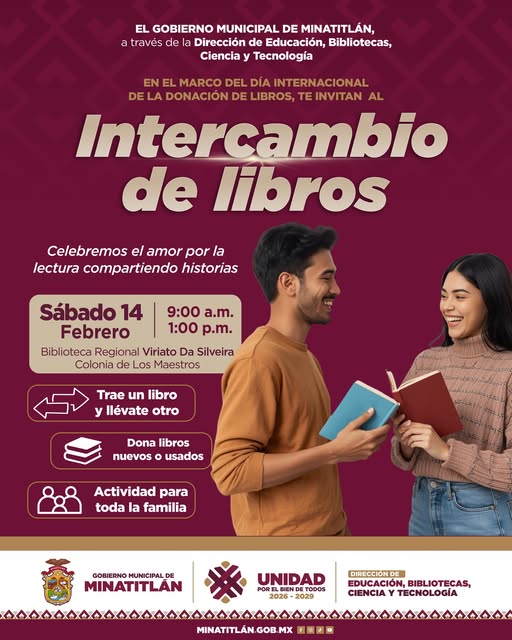El Gobierno Municipal, a través de la Dirección de Bibliotecas, te invita a participar en el intercambio de libros con motivo del Día Internacional de la Donación de Libros.