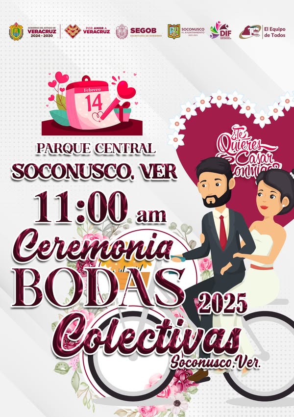 DIF Soconusco, H. Ayuntamiento, Oficialía del Registro Civil, Secretaría de Gobierno y Gobierno del Estado de Veracruz, invitan a la Ceremonia de Bodas Colectivas 2025, viernes 14 de febrero 11:00 am Parque Central Soconusco, Ver.