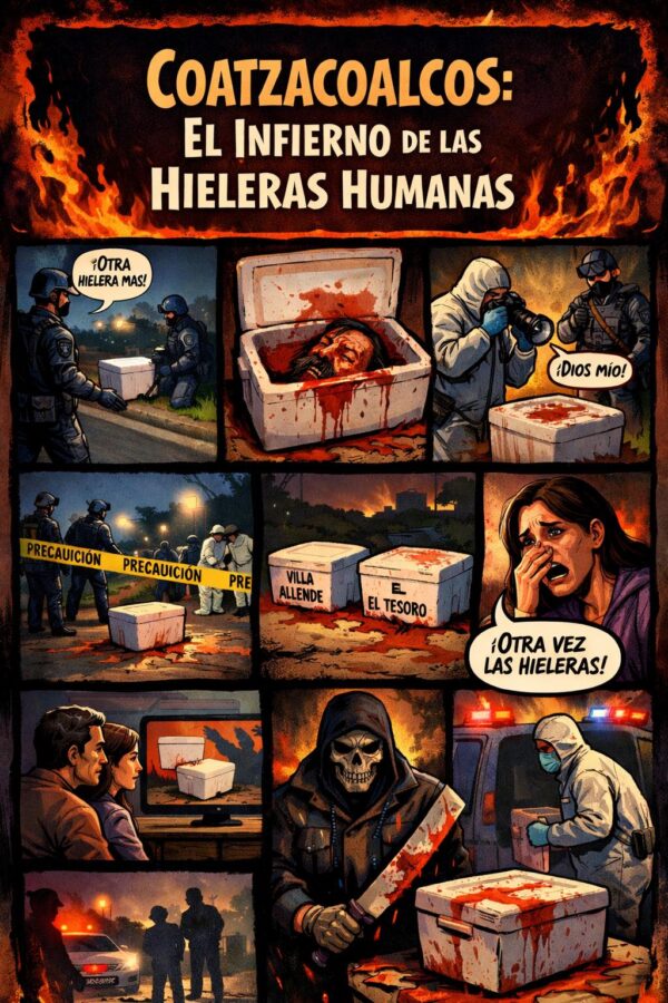 Apenas un día antes, otras dos hieleras habían aparecido como sombras gemelas: una en Villa Allende, otra en la colonia El Tesoro. Tres recipientes en menos de 24 horas. Tres fragmentos del infierno colocados en puntos distintos de Coatzacoalcos, como si alguien estuviera marcando territorio con sangre.
