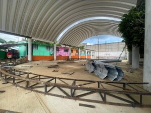 En la escuela primaria José Maria Morelos y Pavón, ubicada en la calle Veracruz, de la cabecera municipal, el equipo de obras públicas se encuentra trabajando en la construcción de un domo y piso firme.
