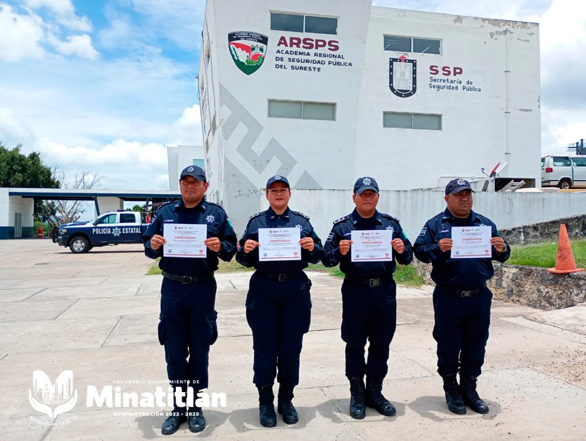 Minatitlán, Ver. – Cuatro elementos de la Policía Municipal de Minatitlán concluyeron con éxito el curso de Actualización en Competencias Básicas de la Función Policial, impartido en la Academia Regional de Seguridad Pública del Sureste, ubicada en El Lencero, Emiliano Zapata Veracruz.