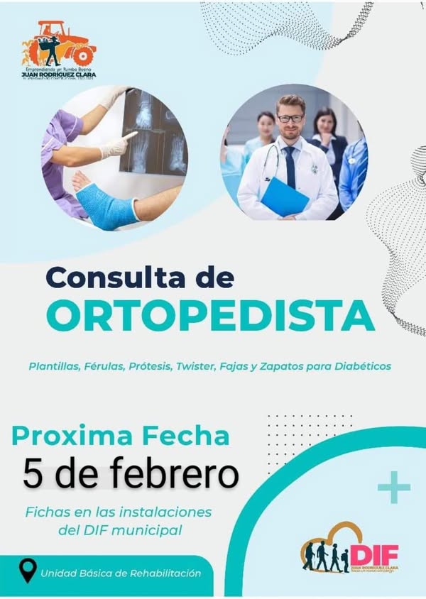 CONSULTA DE ORTOPEDISTA Próxima fecha: Míercoles 5 de Febrero Fichas en las Instalaciones del DIF Municipal Juan Rodríguez Clara, Ver. Unidad Básica de Rehabilitación