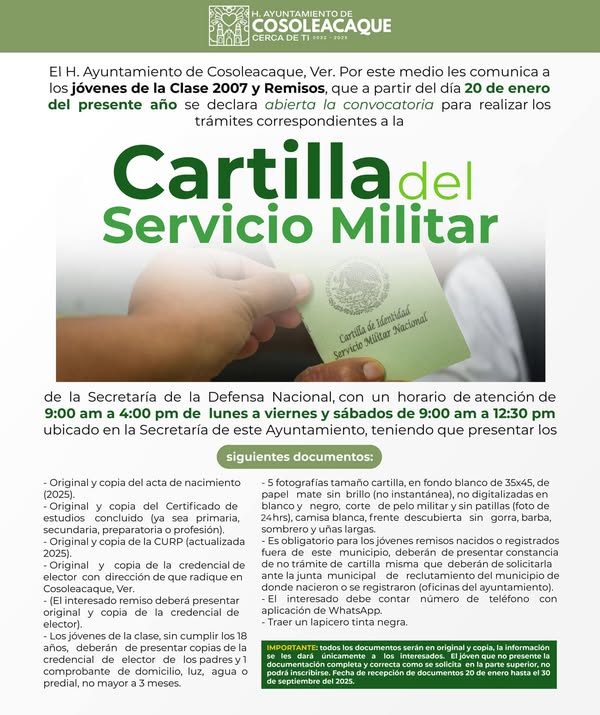 Convocatoria ABIERTA para los trámites correspondientes a la Cartilla del Servicio Militar para los jóvenes de la CLASE 2007 Y REMISOS.
