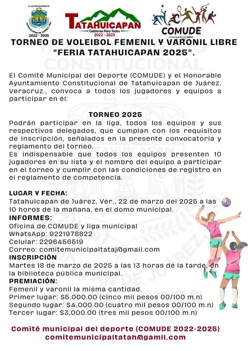 El H. Ayuntamiento te invita a participar en el Torneo de Voleibol 2025, en sus categorías Femenil y Varonil Libre.