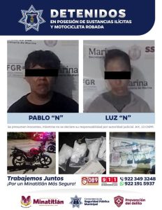 Minatitlán, Ver., – Gracias a los operativos preventivos y disuasivos que lleva a cabo la Policía Municipal de Minatitlán, bajo las estrategias de seguridad implementadas por el Gobierno Municipal que encabeza la Dra. Carmen Medel Palma, se logró la detención de una pareja que transportaba una sustancia ilícita y circulaba en una motocicleta con reporte de robo.