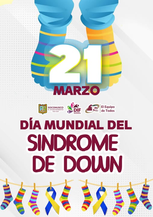 Puede ser una imagen de texto que dice "21 MARZO - SOCONUSCO AYUNTAMIENTO 2002-21005 PONTAMET 8001-2065 DIF 品配 El Equipo de Todos DÍA MUNDIAL DEL SINDROME DE DOWN 美自き"