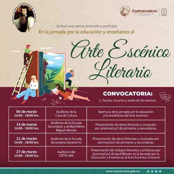 Convocatoria | El Ayuntamiento de Coatzacoalcos invita a participar en la jornada por la educación y la enseñanza al «Arte Escénico Literario». Conoce las fechas, horarios y sedes, así como las bases.