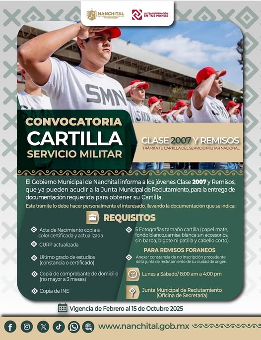 El Ayuntamiento de Nanchital convoca a los jóvenes clase 2007 y Remisos, a que tramiten su Pre-Cartilla en el Palacio Municipal.