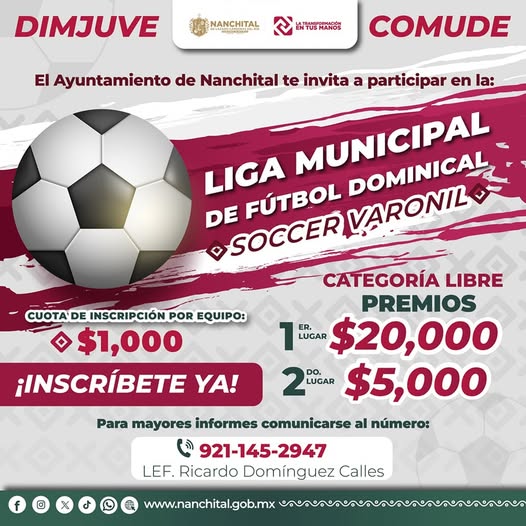 Puede ser una imagen de fútbol y texto que dice "DIMJUVE NANCHITAL ENTUS ENTUSMANOS MANOS COMUDE El Ayuntamiento de Nanchital te invita a participar en la: LIGA MUNICIPAL DOMINICAL DE FÚTBOL SOCCER VARONIL CATEGORÍA LIBRE PREMIOS ER. LUGAR $20,000 2 2GUGAR DO. LUGAR $5,000 Para mayores informes comunicarse al número: C 921-145-2947 LEF. Ricardo Dominguez Calles CUOTA DE INSCRIPCIÓN POR EQUIPO: $1,000 ¡INSCRÍBETE YA! www.nanchital.gob.mx សេសមសសរសលលបសសបសបមសៗបមពទសលក"