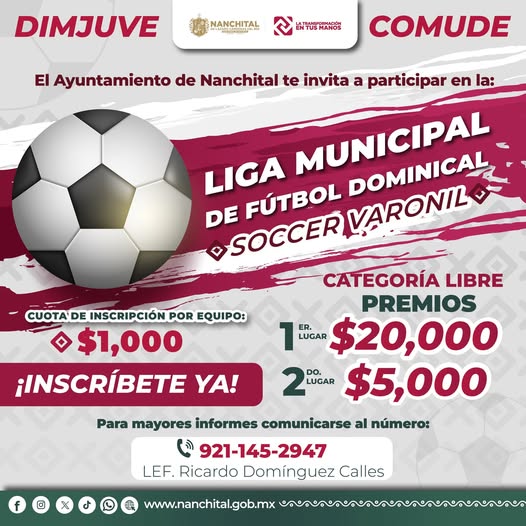 El Ayuntamiento de Nanchital te invita a participar en la Liga Municipal de Fútbol Dominical.