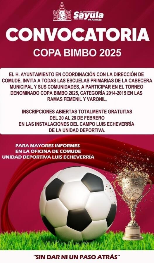 Puede ser una imagen de fútbol, fútbol y texto que dice "S Sayula KATUWTAMIENT 2022-2023 de Alemán CONVOCATORIA COPA BIMBO 2025 EL AYUNTAMIENTO EN COORDINACIÓN CON LA DIRECCIÓN DE COMUDE, INVITA/ A TODAS LAS ESCUELAS PRIMARIAS DE LA CABECERA MUNICIPAL Y SUS COMUNIDADES, A PARTICIPAR EN EL TORNEO DENOMINADO COPA BIMBO 2025, CATEGORIA 2014-2015 EN LAS RAMAS FEMENIL Y VARONIL. INSCRIPCIONES ABIERTAS TOTALMENTE GRATUITAS DEL 20 AL 28 DE FEBRERO EN LAS INSTALACIONES DEL CAMPO LUIS ECHEVERRÍA DE LA UNIDAD DEPORTIVA. PARA MAYORES INFORMES EN LA OFICINA DE COMUDE UNIDAD DEPORTIVA LUIS ECHEVERRIA "SINDARNIUNPASOATRÁS" "SIN DAR NI UN PASO ATRÁS""