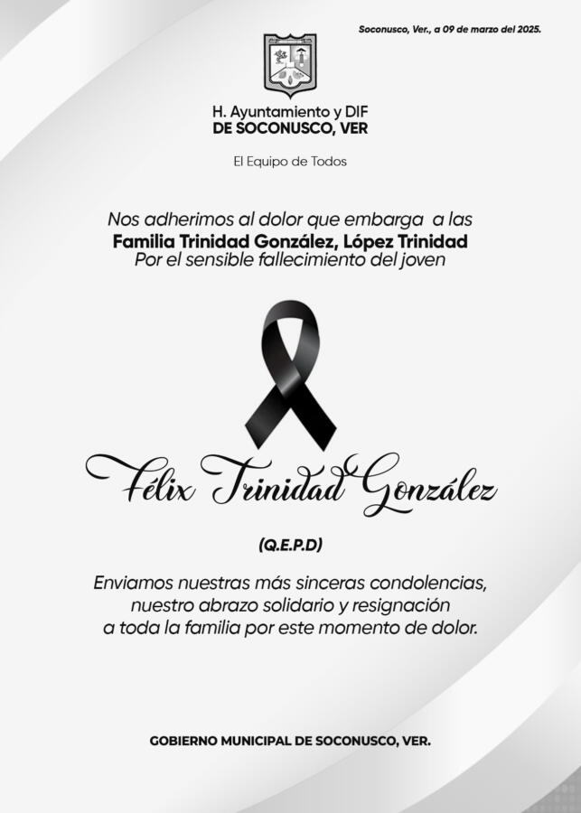 El Gobierno Municipal de Soconusco, Ver., se une a la pena que embargan a las Familias Trinidad González y López Trinidad, por el sensible fallecimiento del joven Félix Trinidad González (Q.E.P.D), rogando al creador pronta resignación en este momento de dolor. Descanse en paz.