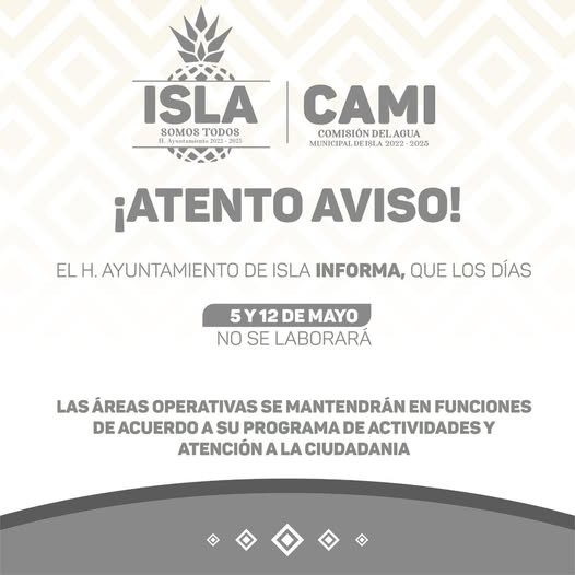 El H. Ayuntamiento de Isla informa, que los días 5 y 12 de mayo no se laborará.