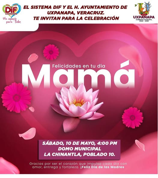 El sistema DIF Uxpanapa en coordinación con el H. Ayuntamiento de Uxpanapa Veracruz, hacen una extensa invitación para la celebración que se llevará al cabo con el motivo del:»Día de las Madres»